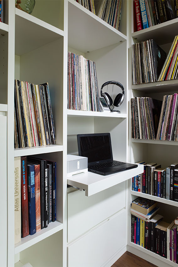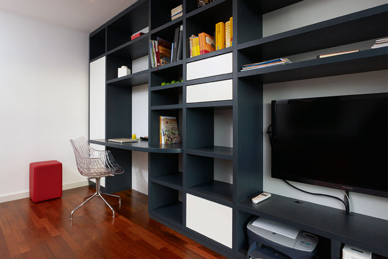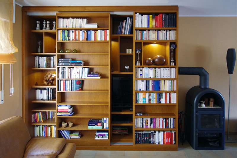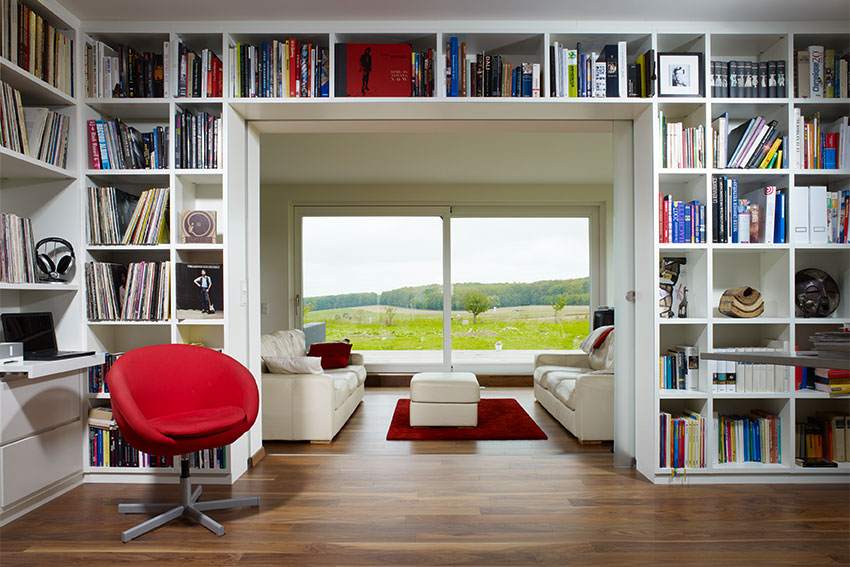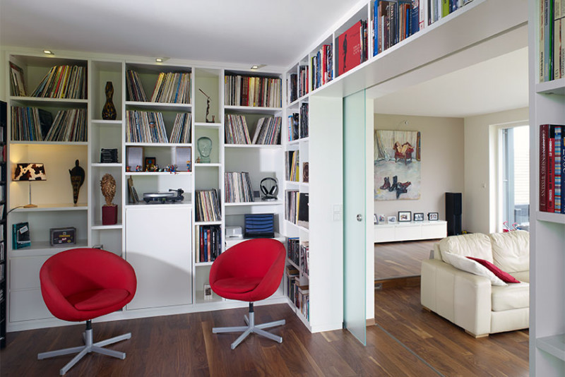 vorhandene Glasschiebetür wurde in Regalwand integriert.