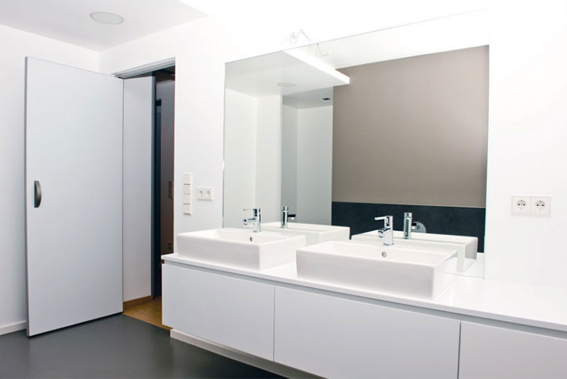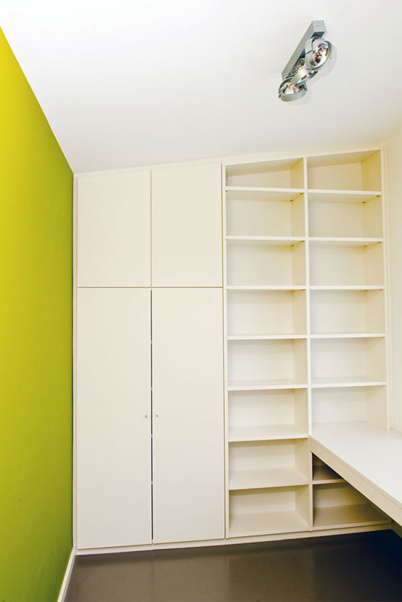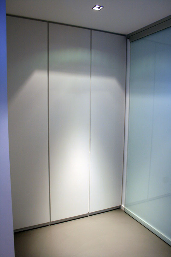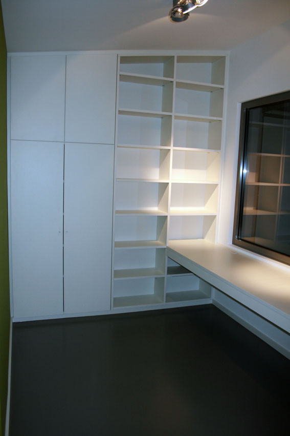 auf der gegenüberliegenden Flurseite kann es als Schuhschrank mit Sitzbank genutzt werden. Getrennt wird das Möbel durch eine hohle Trockenbauwand die auch zur unsichtbaren Verkabelung der Technik dient