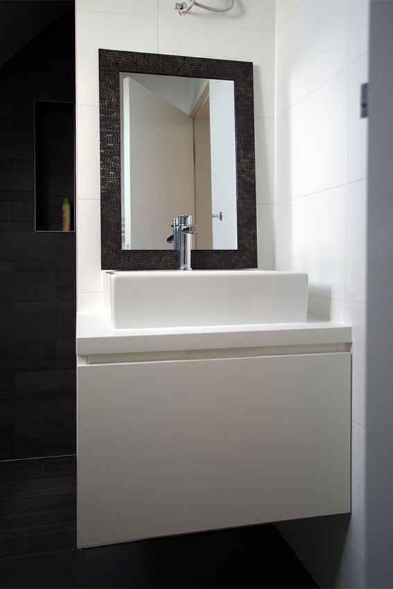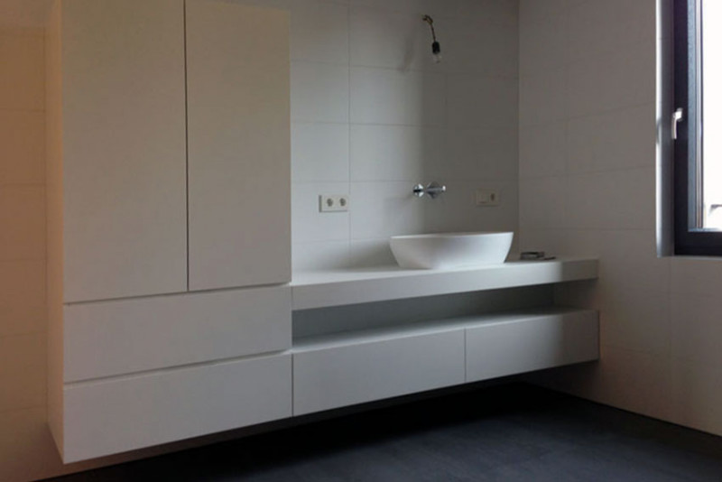 Sonderanfertigungen raumhoher Türen mit Laufschiene sowie Schränke für Flur und Bad zur Nutzung als Garderobe und Stauraum.