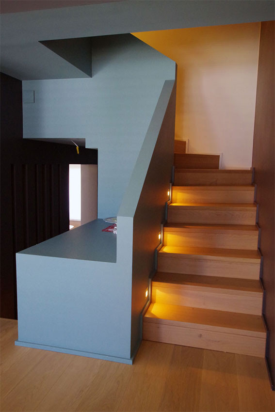 Die Treppen wurden in Faltwerkoptik erstellt und farblich dem Parkettboden angeglichen