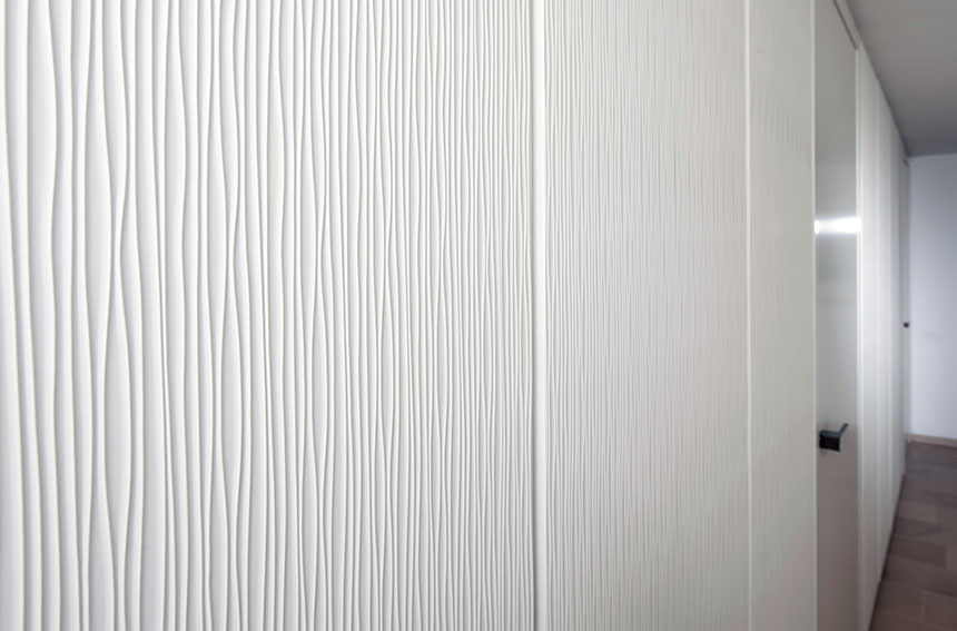 Die Tür ist in griffloser Optik mit Grifffuge. Die Fugenoptik ist bei der gesamten Wand weitergeführt