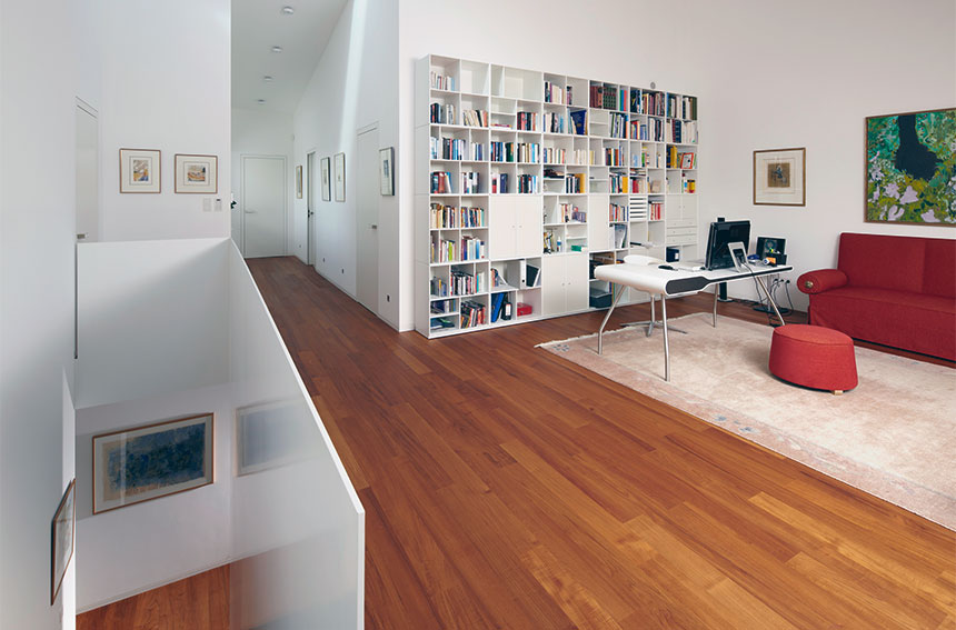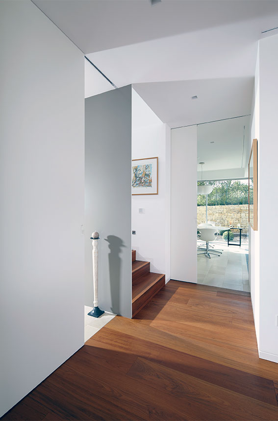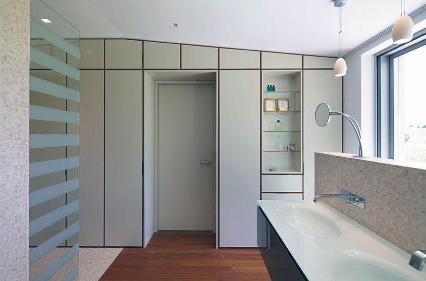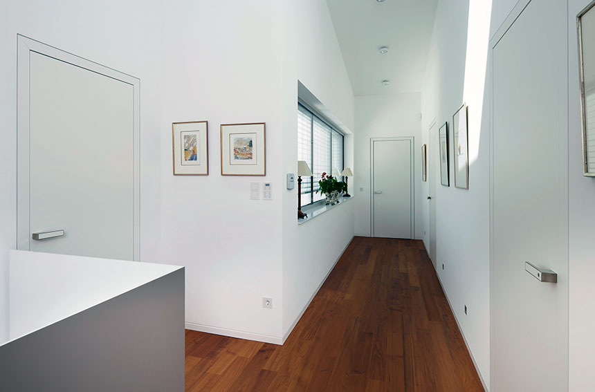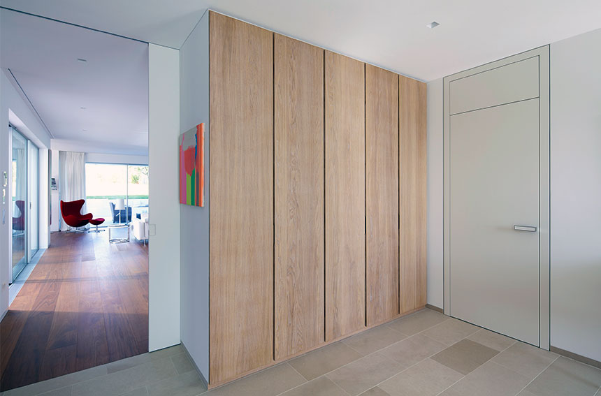 Die Innentüren sind bündig zur Wand eingebaut und zum Teil in die Schrankwände integriert- damit bleibt die flächenbündige Optik auf der Flurseite erhalten