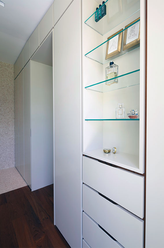 Abstimmung der Hölzer und Lackierungen an die Raumfarbe. Wandabtrennung mit verdeckt liegender Belüftung über umlaufende Schattenfuge. Schiebetüren in Wandtaschen zur flächenbündigen Optik.
