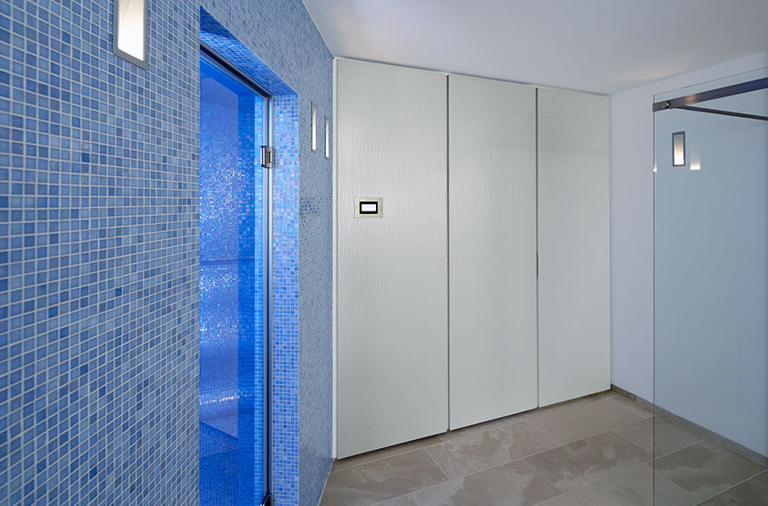 Die Abtrennung im Wellnesraum wurde so konstruiert, dass sie als Zugang zur Technik des Wellnesraums dient